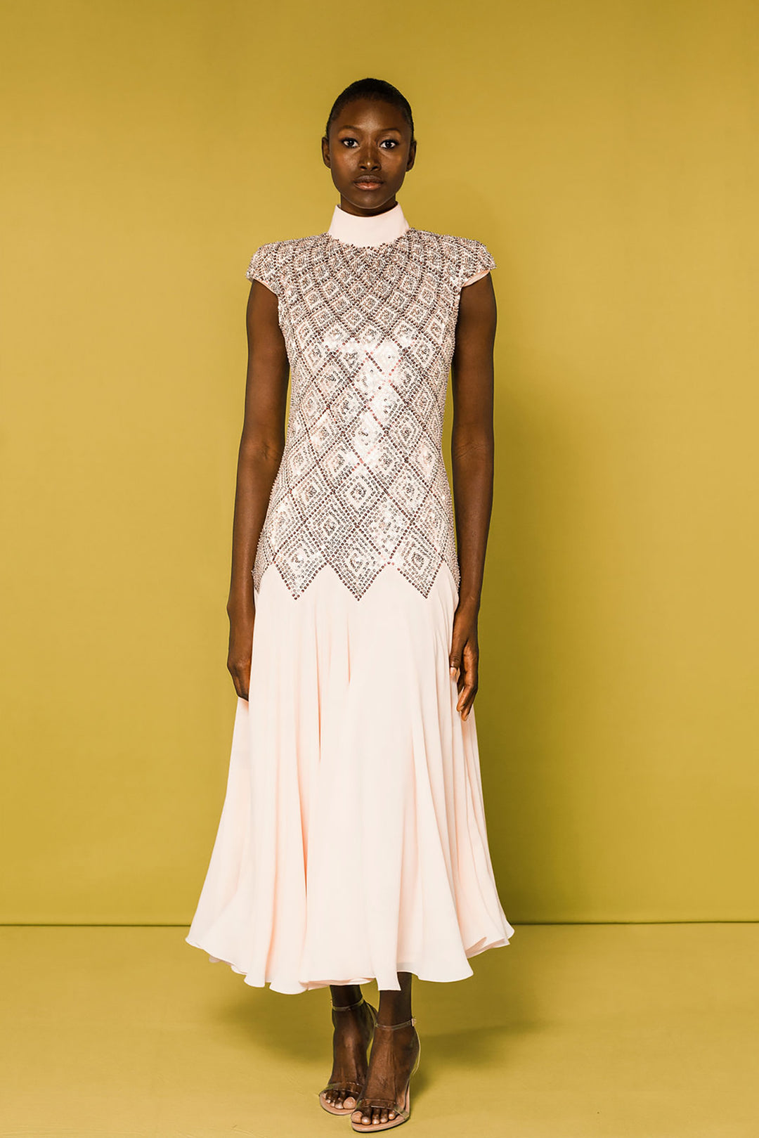 Light pink embroidered midi dress. Featuring a turtle neck, cape sleeves, and a completely embroidered bodice in geometric patterns. Complemented with a pleated A-line midi skirt.