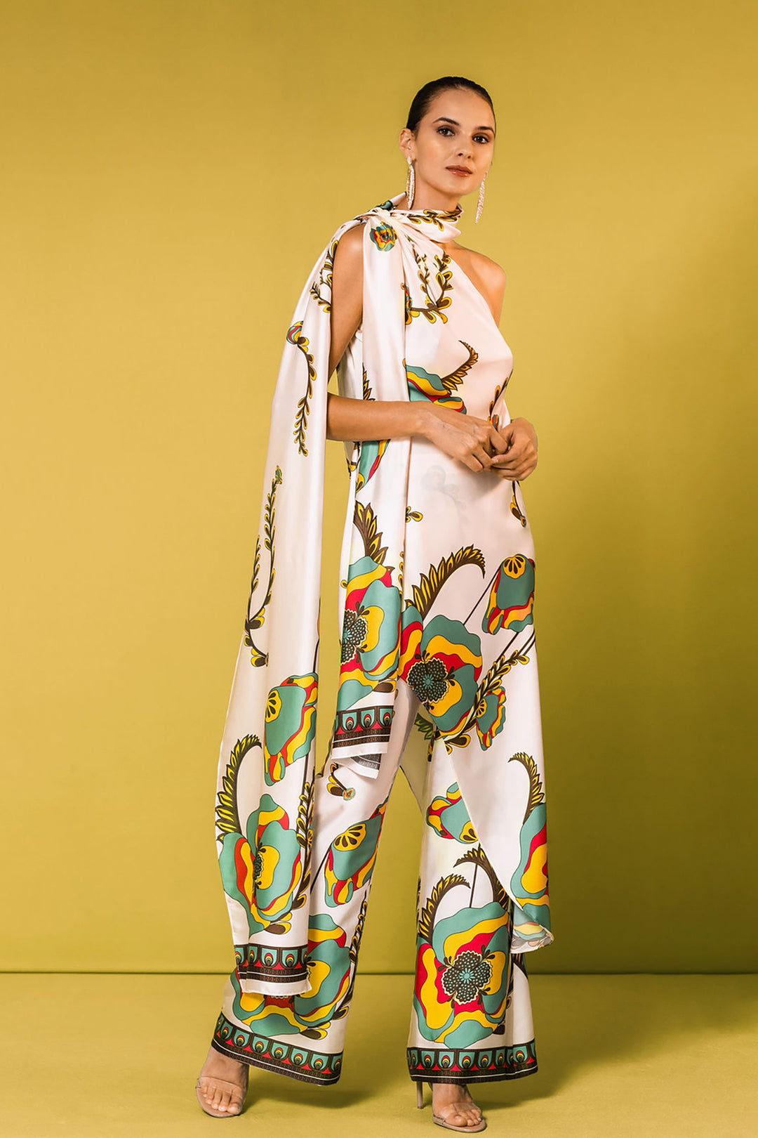 White printed ensemble. Featuring a sleeveless flowy long blouse, with an asymmetric hemline, and a wraparound neck piece that flows on one side off-the-shoulder. Complemented with flared printed pants.
