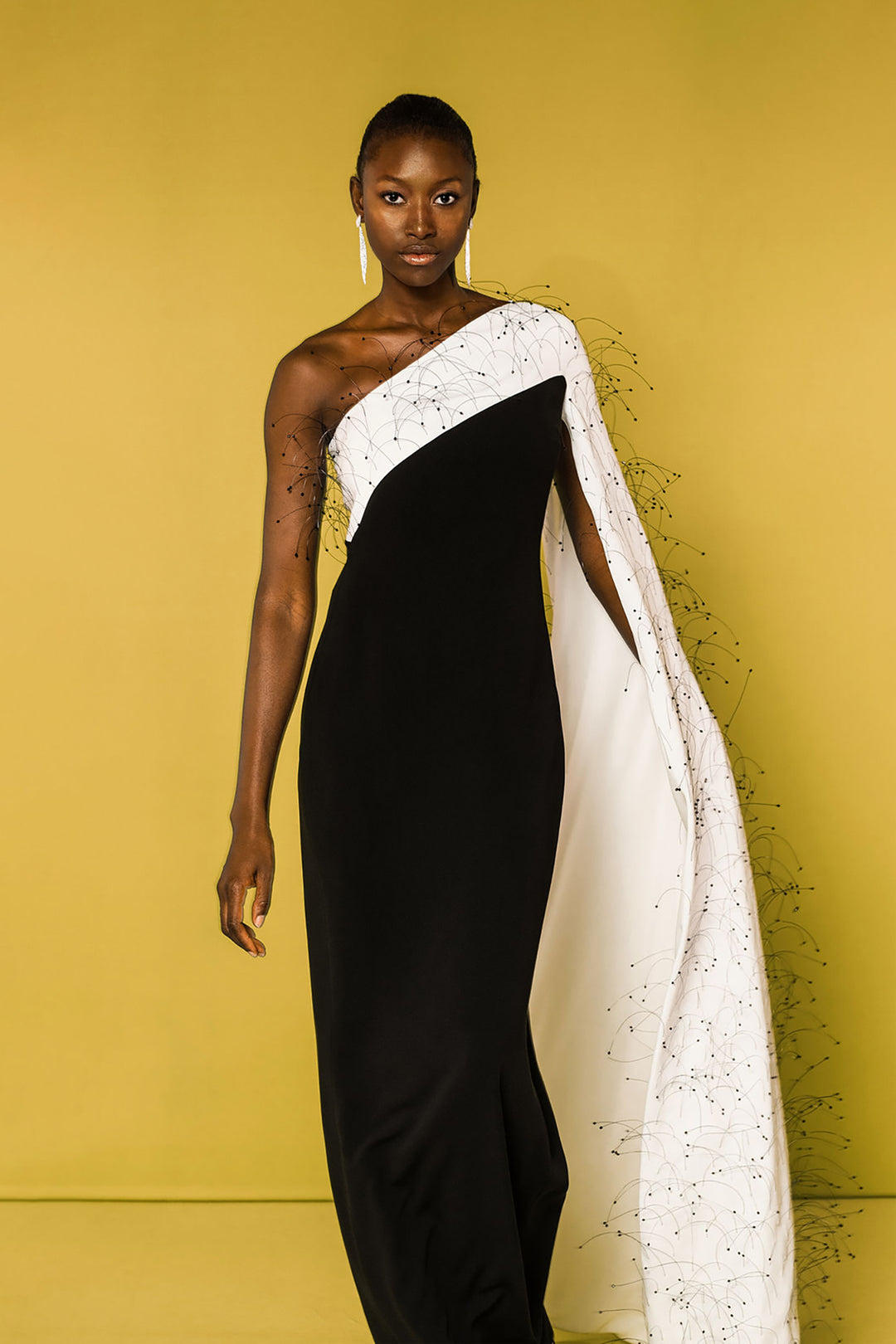 Black and white one-shoulder column dress. Featuring an asymmetric neckline, and a cape sleeve that flows floor length. Complemented with a black column dress, and protruding fringe detailing around the white neckline and cape.