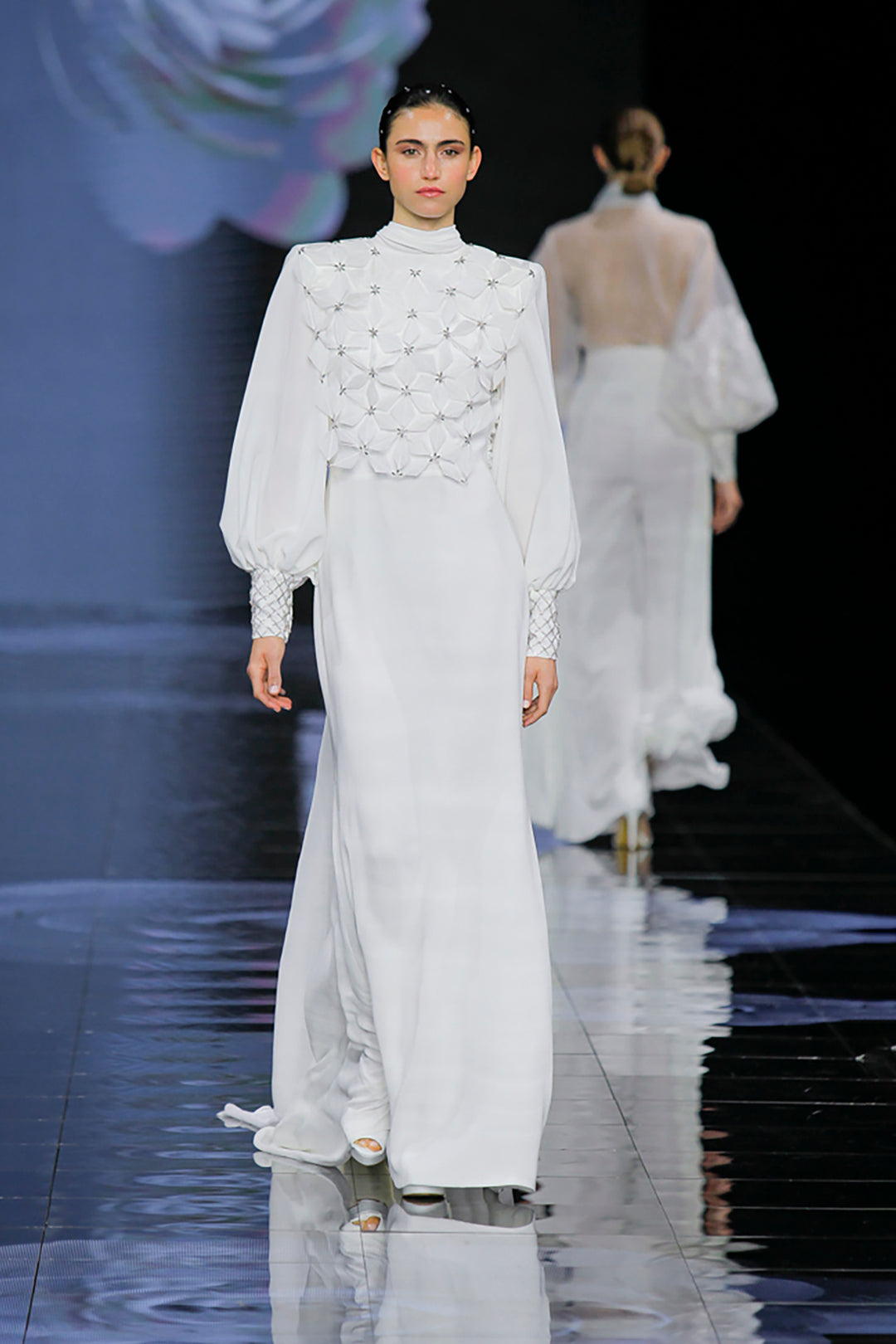 White long-sleeved mermaid dress. Featuring a turtle neck, long slightly puffed georgette sleeves, and a feathered bust. Complemented with a mermaid skirt, and a sweep train.