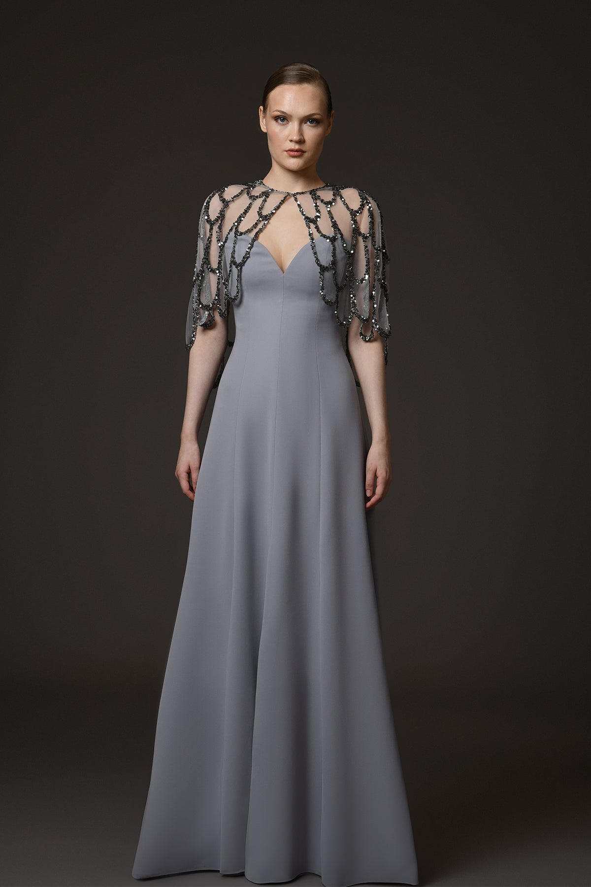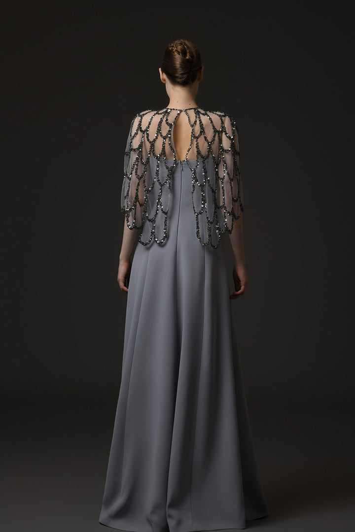 Grey crêpe long dress. Featuring an A-line silhouette, embroidered bolero, and sweetheart neckline. Complemented with short sleeves.